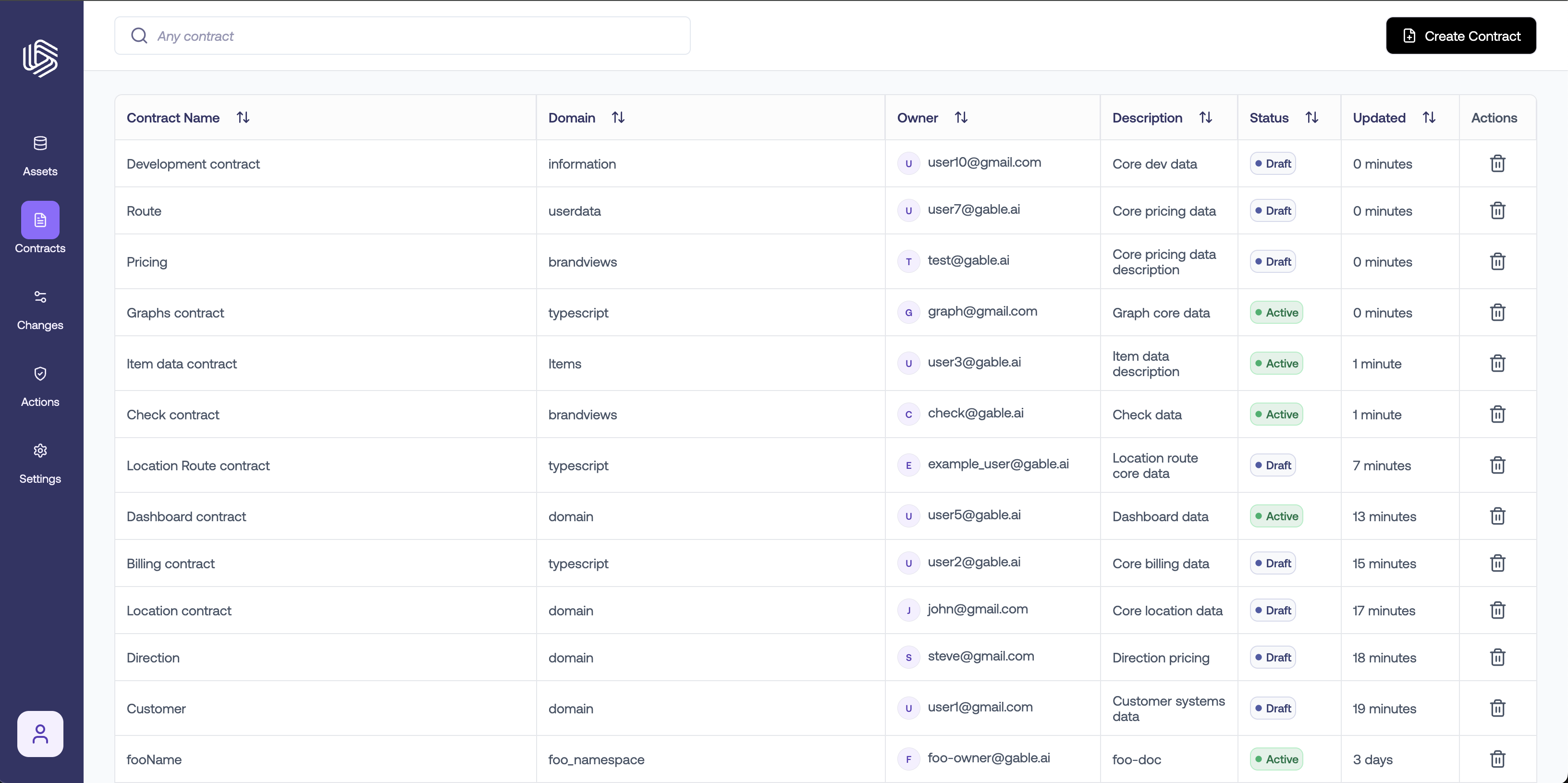 . The contract table view displays a list of existing contracts with information on domain, ownership, descriptions, and contract status.