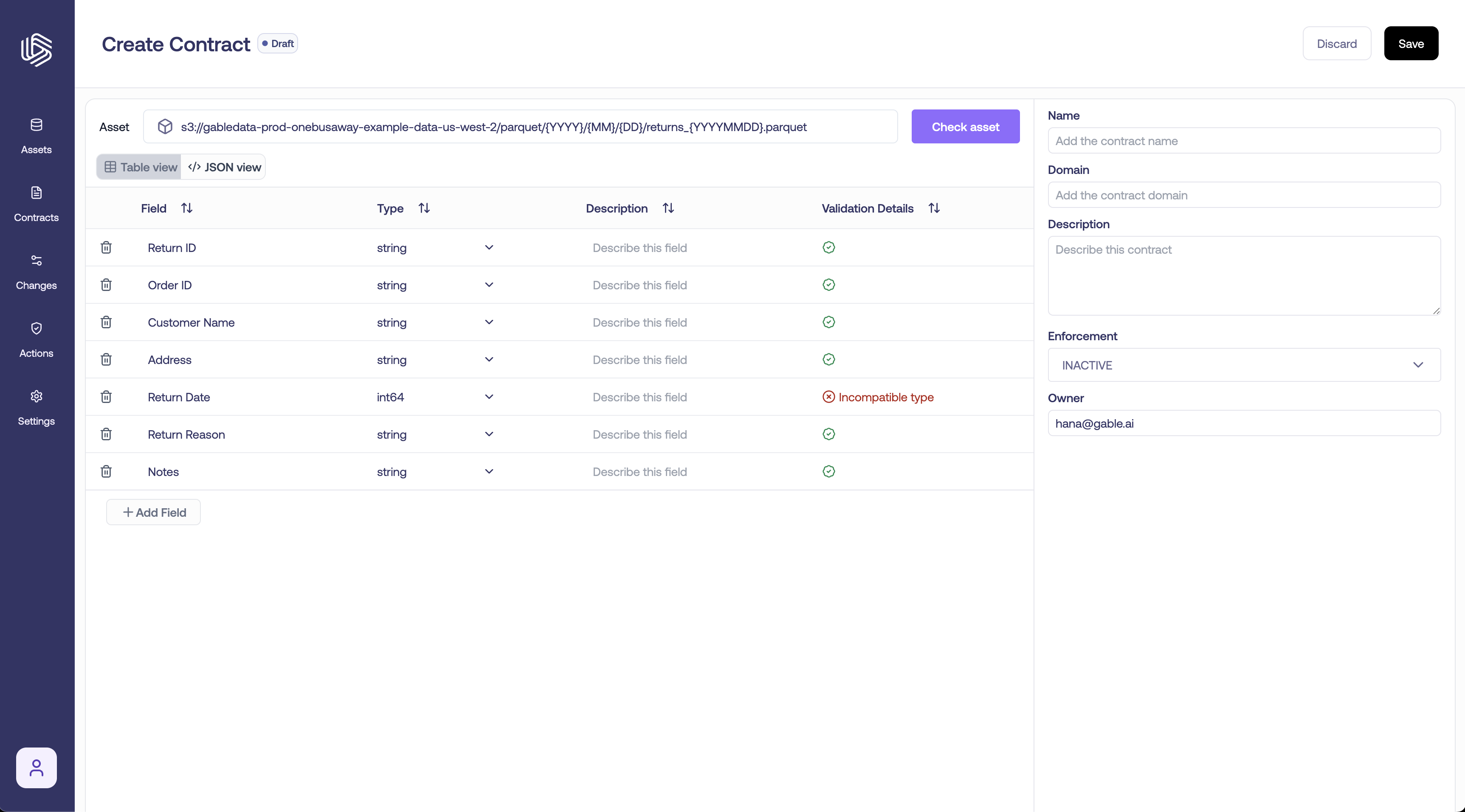 in the upper right. The contract definition will be pre-populated based on that asset schema. Fields can be added, edited, and removed. Check an asset’s compliance with the Check asset